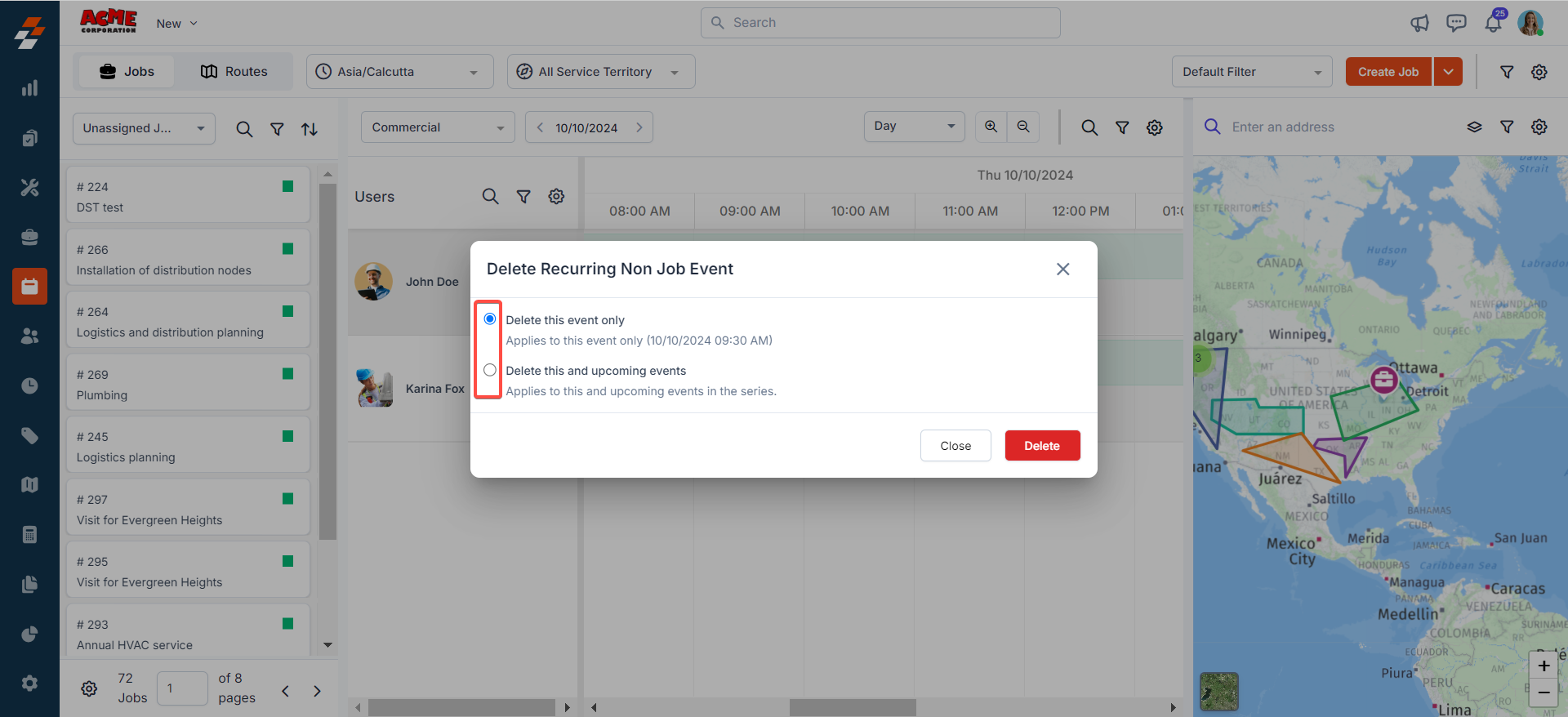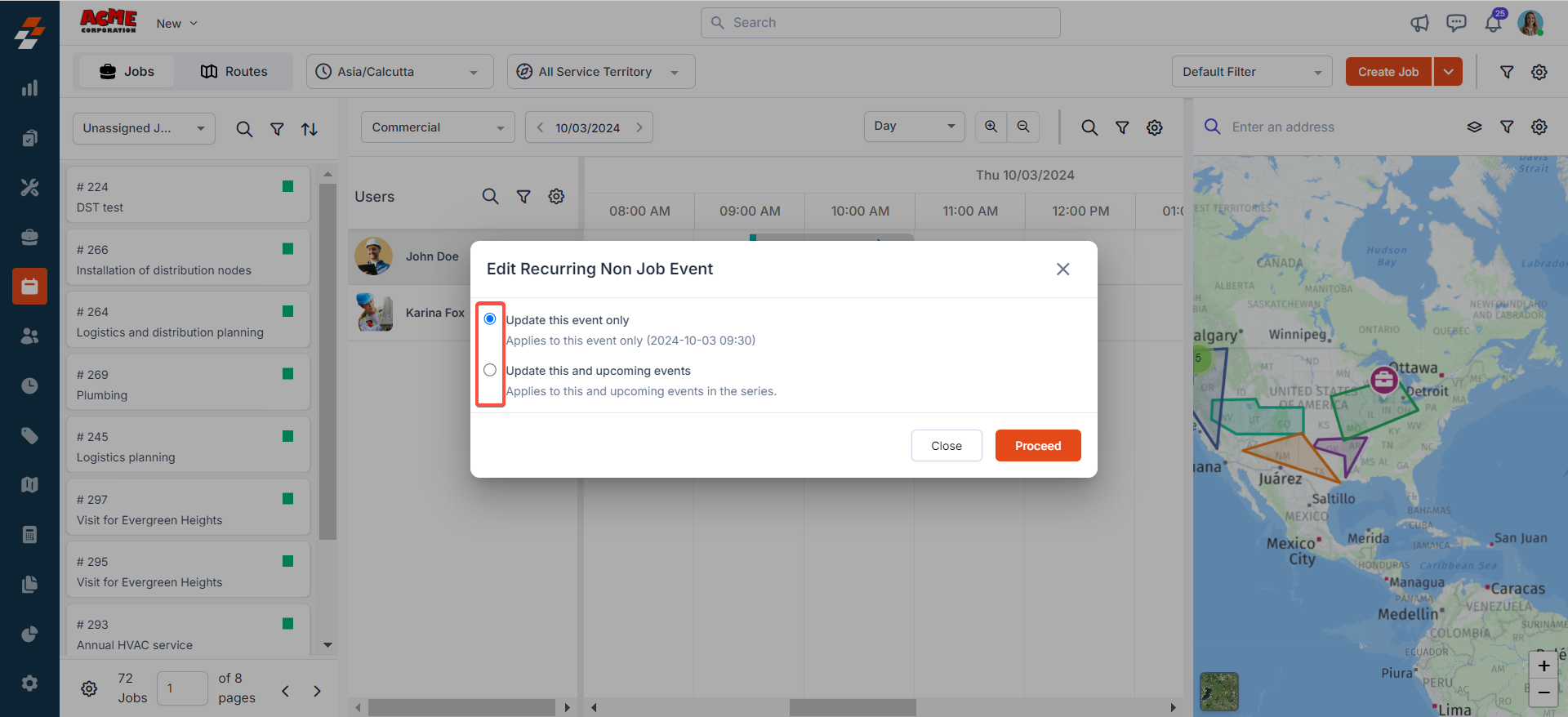 To view and edit a non-job event, follow these steps:- Select the specific event on the calendar or dispatch board. This will open the non-job event details on the right, showing all relevant information.