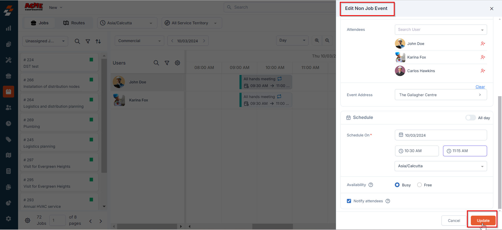 - Once you’ve made the necessary changes, click the “Update” button to save the updated event details. The changes will also be notified to the relevant attendees.