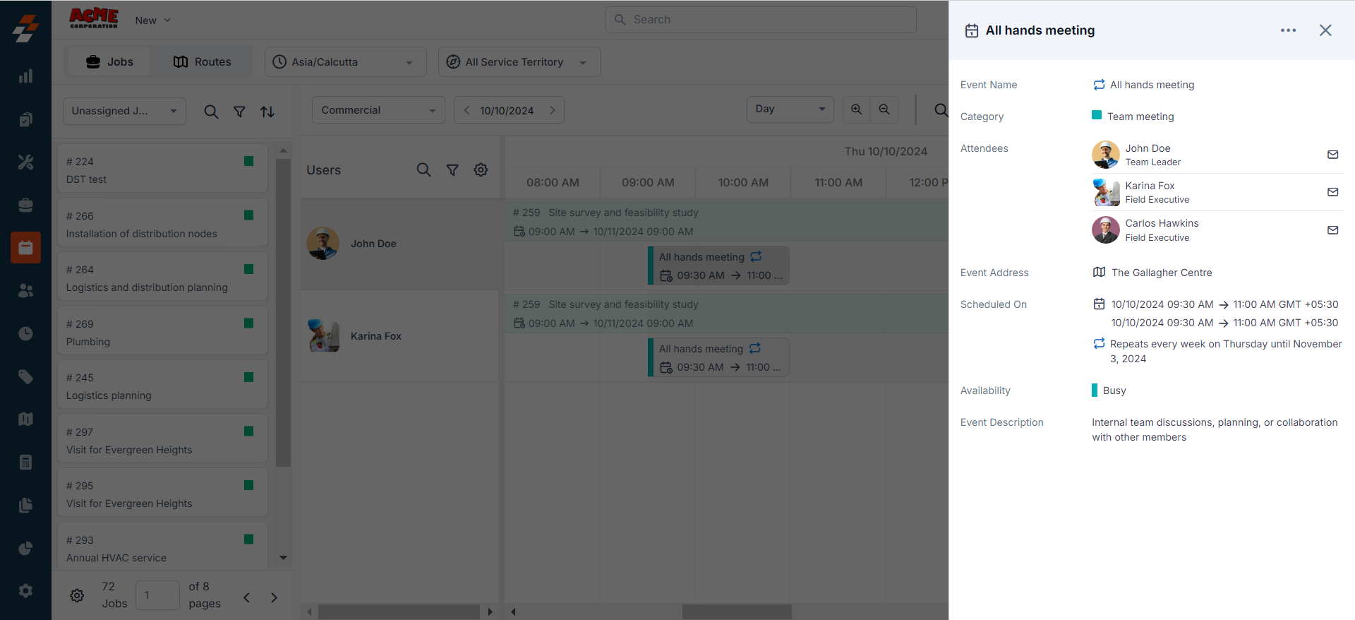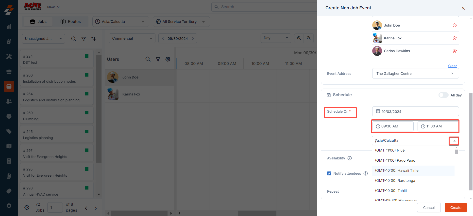 - After entering the required details, click the Create button. The non-job event will be successfully created for the selected date and time and will appear on the Dispatch Board and the Calendar alongside the attendees.