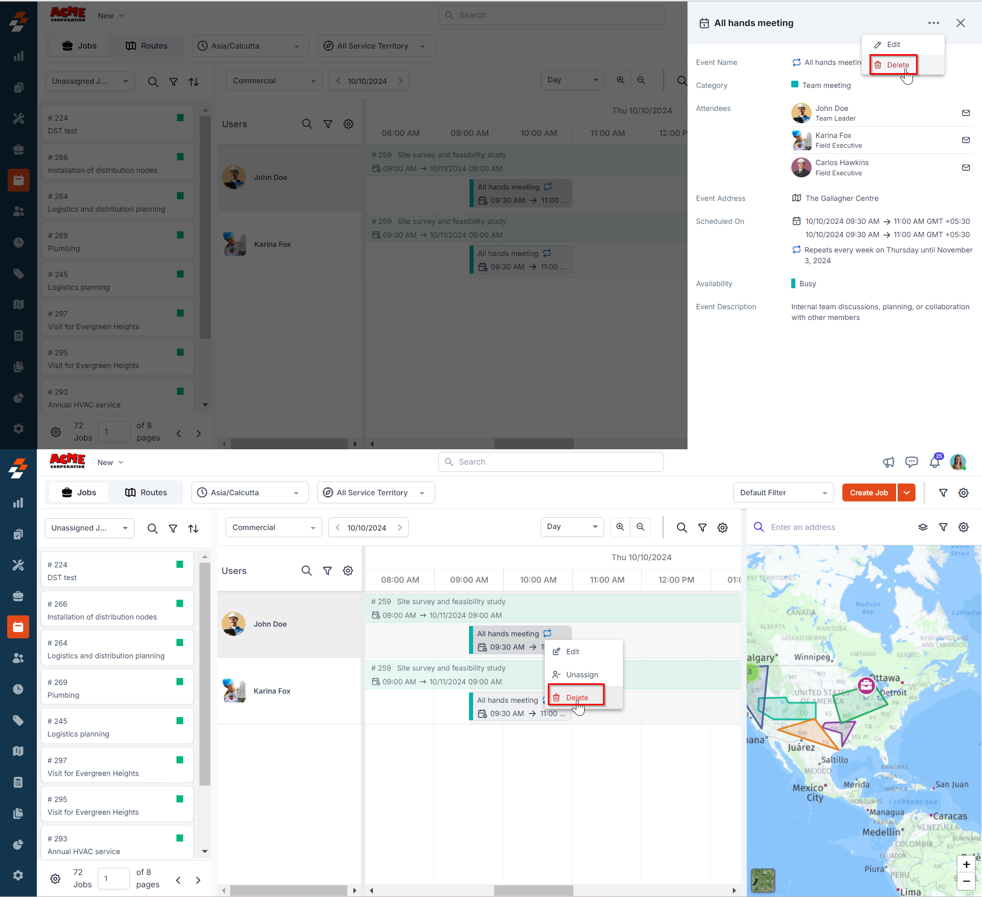 Click the ellipsis icon (three dots) at the top right of the page and select “Delete.” A confirmation pop-up will appear. Click “Delete” to proceed. Alternatively, you can also right-click on an event and choose the “Delete” option.