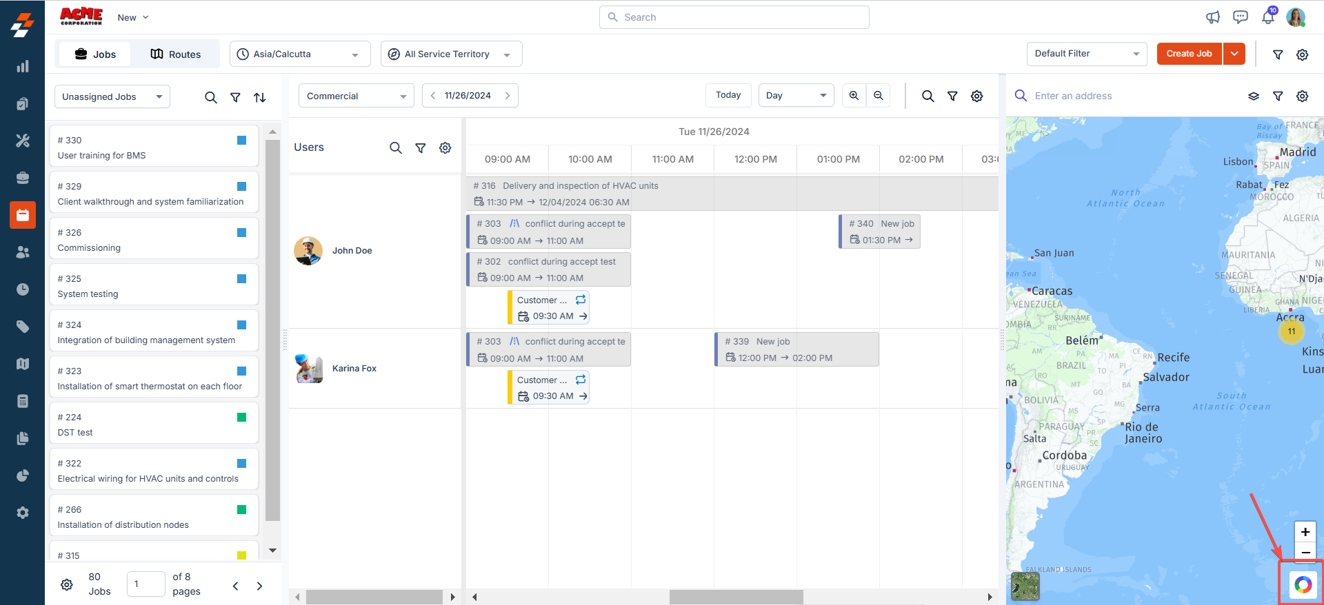 Map is one of the critical layouts on the dispatch board, located on the right side, and it provides an overview of jobs, routes, users, customers, properties, assets, and service territory locations on the map. You can also choose which locations to display on the map by selecting a specific layer from the top of the map. Once chosen, click the “Apply” button. Based on the applied layer, you can view only the specific entities locations. For example, when you select both jobs and routes, you can view the locations of jobs and routes, as well as the jobs listed in the dispatcher queue and scheduler, all displayed on the map.