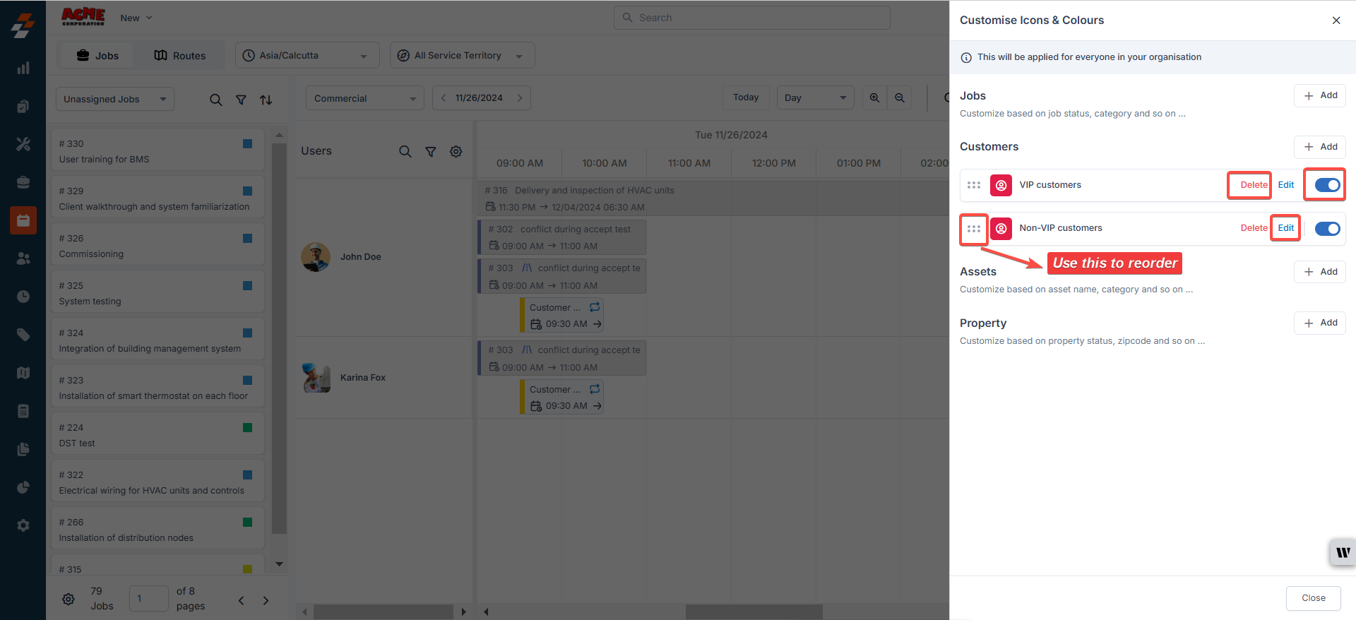 - Jobs: Use different colors/icons based on status (e.g., on-hold jobs in red, completed jobs in green, in-progress jobs in blue) or category (e.g., Installation job category in blue, Maintenance job category in Green, delivery job category in Red).