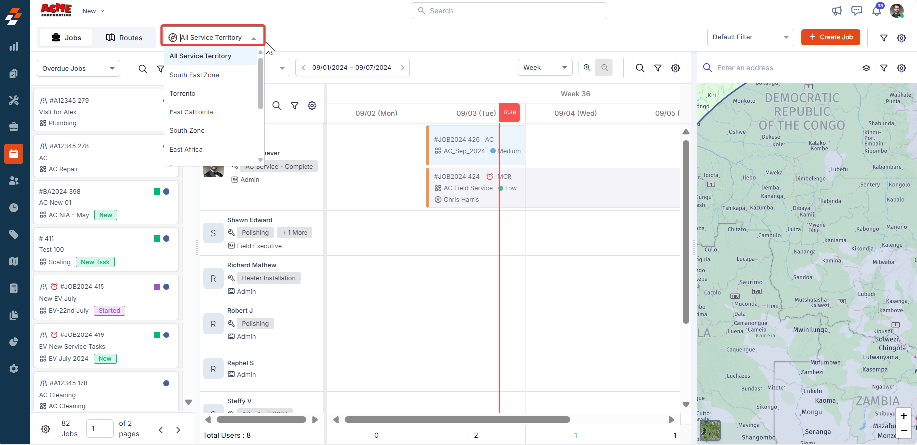 - Jobs: The Jobs layout will display only the jobs in the selected Service Territories.