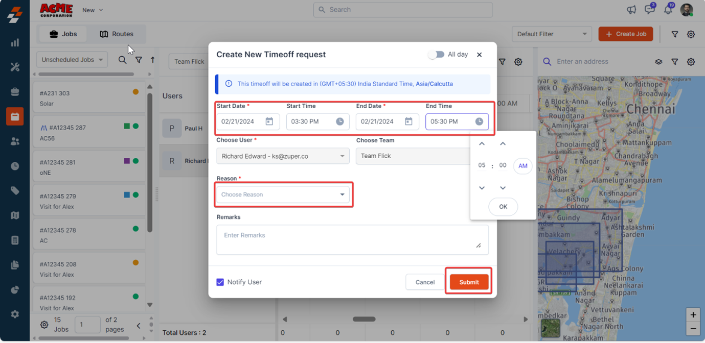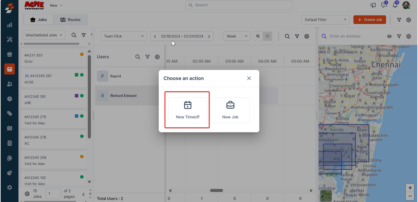 You can create a new job or time-off for a user directly from the scheduler. This quickly enables you to manage the technician’s workload and availability efficiently, ensuring seamless operations and optimal resource utilization.Scheduler – Creating New Job