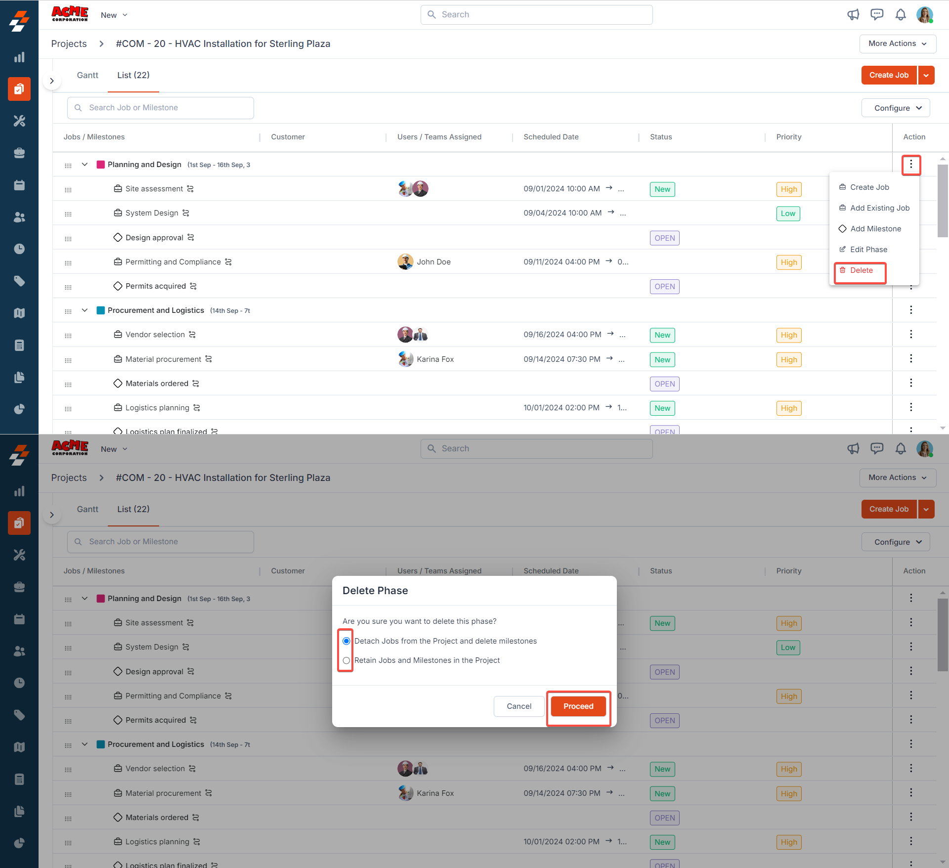 Detach jobs from the project and delete milestones - This option deletes the phase, detaches jobs from the project (the detached jobs can still be accessed from the Jobs module) and deletes any milestones in the phase.